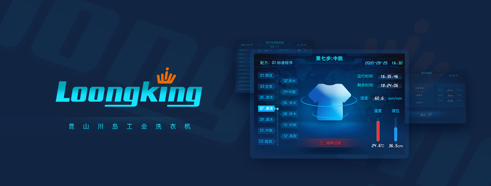 昆山工業(yè)洗衣機(jī)顯示屏與實(shí)體按鍵為一體,讓操作人員能夠更加直觀的將實(shí)體鍵與功能界面相連接,但會使屏幕占比較小,考慮到界面的可觀性,適當(dāng)?shù)恼{(diào)整界面字體大小和界面元素比例。同時要保證界面美觀,在此項(xiàng)目中采用科技風(fēng)設(shè)計(jì),用科技線條構(gòu)建標(biāo)題背景,讓文字在放大的同時不會讓人感覺呆板。主體背景融合全球化概念營造品牌調(diào)性,半透明質(zhì)感作為文本底使文字更加突出,方便相關(guān)操作人員查看選擇。