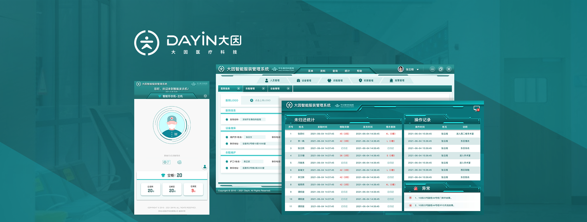 大因醫(yī)療針對醫(yī)院手術衣、手術鞋的收取制定智能收發(fā)衣鞋系統(tǒng)。這個系統(tǒng)分為三個端口,分別為PC端、大屏端、安卓柜體端,端口之間可連接,這就要求三個端的風格必須和而不同。整個風格以親和友善的綠色為主,加以立體的效果,展現(xiàn)界面空間感的同時增加現(xiàn)代科技感。