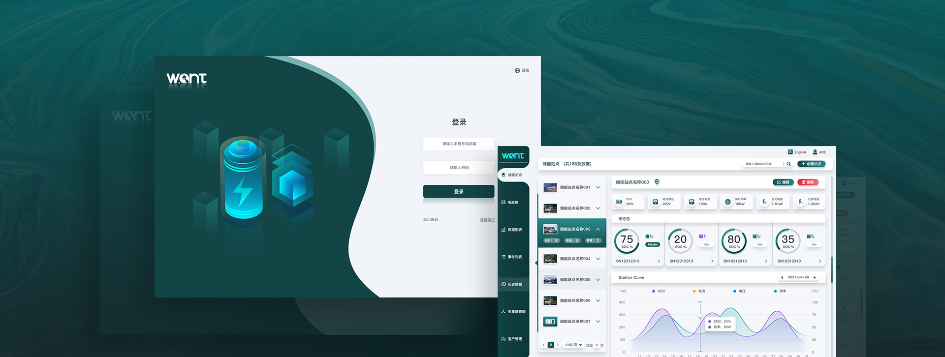 以沃克安特新能源技術(shù)有限公司的logo色為基礎(chǔ),結(jié)合新能源行業(yè)的特殊屬性,選用偏藍的綠色為主顏色,使整體界面風格更加清新、自然,緊貼綠色新能源的特征。在UI設(shè)計時考慮用戶使用習慣,對UI交互進行合理梳理,不斷在細節(jié)處精細化,使界面更加柔和、穩(wěn)定,讓用戶使用時更感到溫和、安心。龐大的文字信息以更加友好的可視化形式表現(xiàn)出來,提高用戶好感及使用效率。
